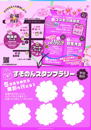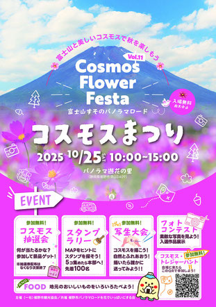 参加無料のイベントが盛りだくさん! ・コスモス抽選会 - 何が当たるかお楽しみ! ・写生大会 - コスモスを描こう!自然とふれあおう! ・すそのんスタンプラリー - 5個集めて本部へGO!(先着100名様にプレゼント) ・フォトコンテスト - 素敵な写真を撮って応募しよう! ・地元グルメ - おいしいものをいろいろ味わおう! ・コスモス・トレジャーハント も開催! 富士山を背景に咲き誇る美しいコスモス畑で、家族みんなで楽しい秋の一日を過ごしませんか?
